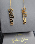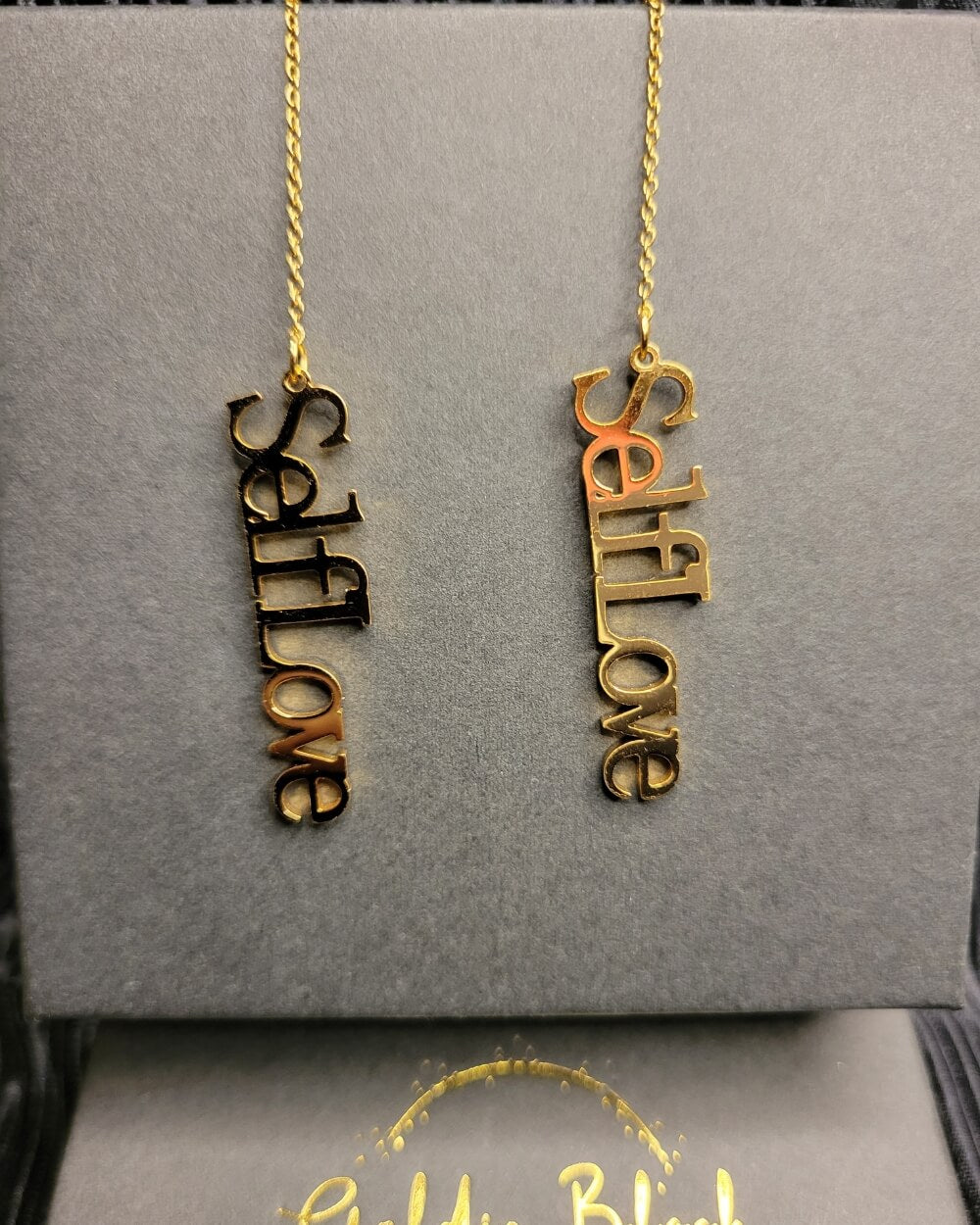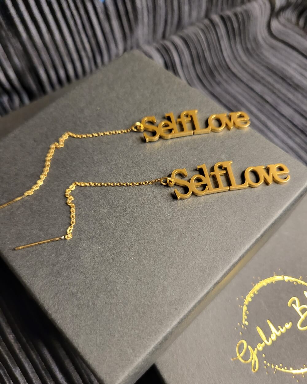 Embrace self-love with this inspiring and timeless beautiful threaded tassels SelfLove lettering earrings with linear chain, will bring a soft flair. These earrings are not just a piece of jewelry but a symbol of empowerment and self-care. It serves as a thoughtful gift for yourself or a loved one, reminding them of the importance of self-love and embracing one’s individuality with grace and confidence.